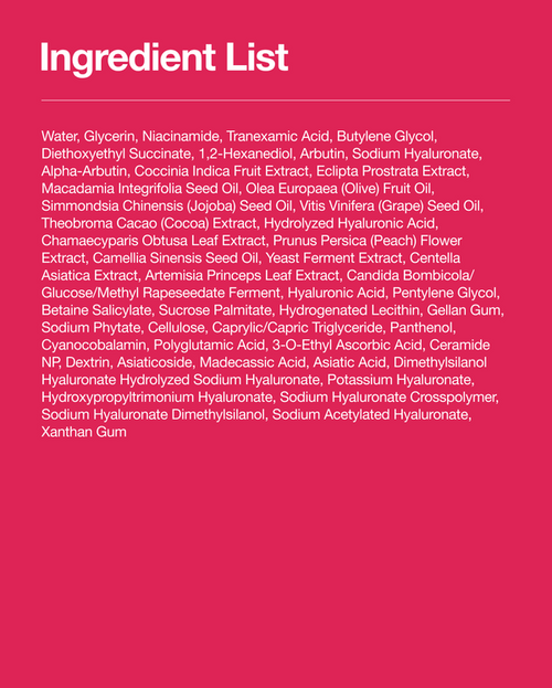 INGREDIENTS: Water, Glycerin, Niacinamide, Tranexamic Acid, Butylene Glycol, Diethoxyethyl Succinate, 1,2-Hexanediol, Arbutin, Sodium Hyaluronate, Alpha-Arbutin, Coccinia Indica Fruit Extract, Eclipta Prostrata Extract, Macadamia Integrifolia Seed Oil, Olea Europaea (Olive) Fruit Oil, Simmondsia Chinensis (Jojoba) Seed Oil, Vitis Vinifera (Grape) Seed Oil, Theobroma Cacao (Cocoa) Extract, Hydrolyzed Hyaluronic Acid, Chamaecyparis Obtusa Leaf Extract, Prunus Persica (Peach) Flower Extract, Camellia Sinensis Seed Oil, Yeast Ferment Extract, Centella Asiatica Extract, Artemisia Princeps Leaf Extract, Candida Bombicola/Glucose/Methyl Rapeseedate Ferment, Hyaluronic Acid, Pentylene Glycol, Betaine Salicylate, Sucrose Palmitate, Hydrogenated Lecithin, Gellan Gum, Sodium Phytate, Cellulose, Caprylic/Capric Triglyceride, Panthenol, Cyanocobalamin, Polyglutamic Acid, 3-0-Ethyl Ascorbic Acid, Ceramide NP, Dextrin, Asiaticoside, Madecassic Acid, Asiatic Acid, Dimethylsilanol Hyaluronate, Hydrolyzed Sodium Hyaluronate, Potassium Hyaluronate, Hydroxypropyltrimonium Hyaluronate, Sodium Hyaluronate Crosspolymer, Sodium Hyaluronate Dimethylsilanol, Sodium Acetylated Hyaluronate, Xanthan Gum