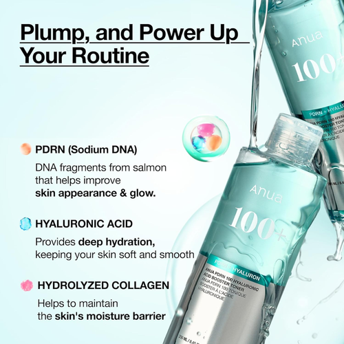 Anua PDRN 100 Hyaluronic Acid Booster Toner – deeply hydrates, strengthens skin barrier, boosts radiance. Lightweight, absorbs quickly, suitable for sensitive skin.