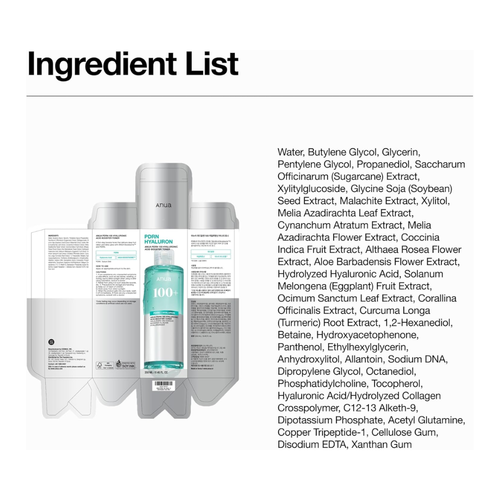 INGREDIENTS: Water, Butylene Glycol, Glycerin, Pentylene Glycol, Propanediol, Saccharum Officinarum Extract, Xylitylglucoside, Glycine Soja Seed Extract, Malachite Extract, Xylitol, Melia Azadirachta Leaf Extract, Vincetoxicum Atratum Extract, Melia Azadirachta Flower Extract, Coccinia Indica Fruit Extract, Althaea Rosea Flower Extract, Aloe Barbadensis Flower Extract, Hydrolyzed Hyaluronic Acid (0.5ppm), Solanum Melongena Fruit Extract, Ocimum Sanctum Leaf Extract, Corallina Officinalis Extract, Curcuma Longa Root Extract, 1,2-Hexanediol, Betaine, Hydroxyacetophenone, Panthenol, Ethylhexylglycerin, Anhydroxylitol, Allantoin, Sodium DNA (100ppm), Dipropylene Glycol, Octanediol, Phosphatidylcholine, Tocopherol, Hyaluronic Acid/Hydrolyzed Collagen Crosspolymer (0.05ppm), C12-13 Alketh-9, Dipotassium Phosphate, Acetyl Glutamine, Copper Tripeptide-1, Cellulose Gum, Disodium EDTA, Xanthan Gum