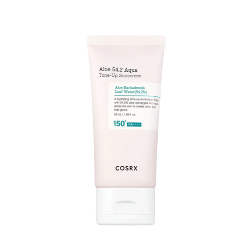 COSRX Aloe 54.2 Aqua Tone-Up Sun Cream hydrates with aloe vera, niacinamide, and Vitamin B12. Reef-safe and cruelty-free. Ideal for sensitive skin.