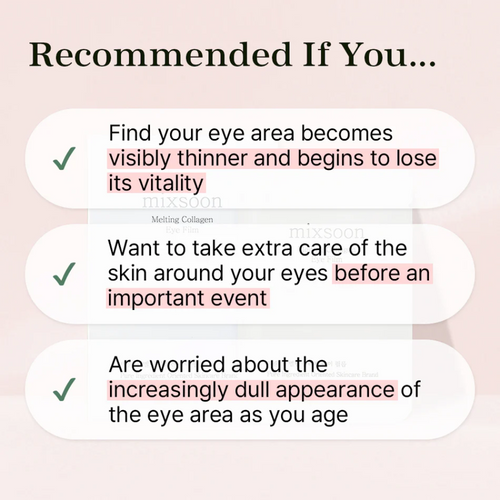 Mixsoon Melting Collagen Eye Film: Instant firming & plumping, targets wrinkles & hydration. Safe for sensitive skin, versatile use.